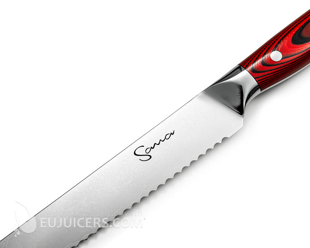 Le couteau à pain Sana de 20 cm en acier damas est conçu avec expertise à partir de 67 couches d’acier damas, enveloppant un noyau en acier VG10. Cette fabrication garantit une extrême netteté, une durabilité exceptionnelle du fil, ainsi qu’une excellente résistance à la corrosion.